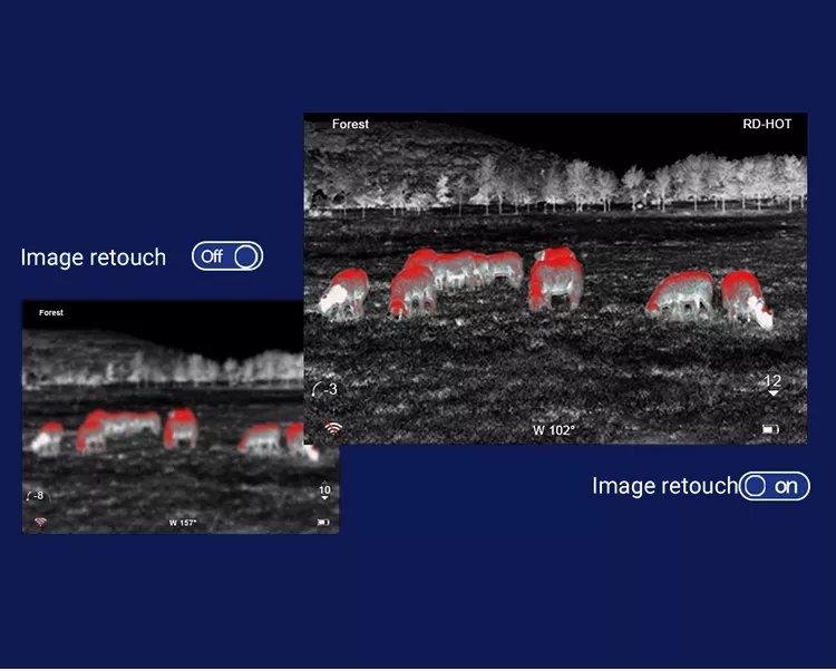 Термокамерата Helion 2 Pro създава ясни, висококонтрастни изображения, които точно проследяват контурите и показват информация за най-малките обекти и области с минимална температурна разлика. Ловците могат ясно да идентифицират целите и фоновите обекти и точно да оценят трофеите.