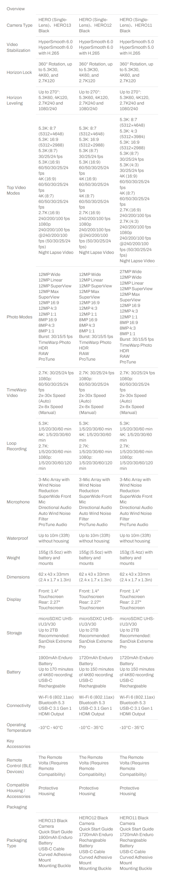 Nowy, większy akumulator Enduro o pojemności 1900 mAh posiada przeprojektowane złącze akumulatora specjalnie dla kamery HERO13 Black, co zapewnia większą wydajność i dłuższy czas pracy, umożliwiając do 2,5 godziny ciągłego nagrywania. Akumulatory Enduro do kamery HERO13 Black nie są kompatybilne ze starszymi kamerami GoPro.